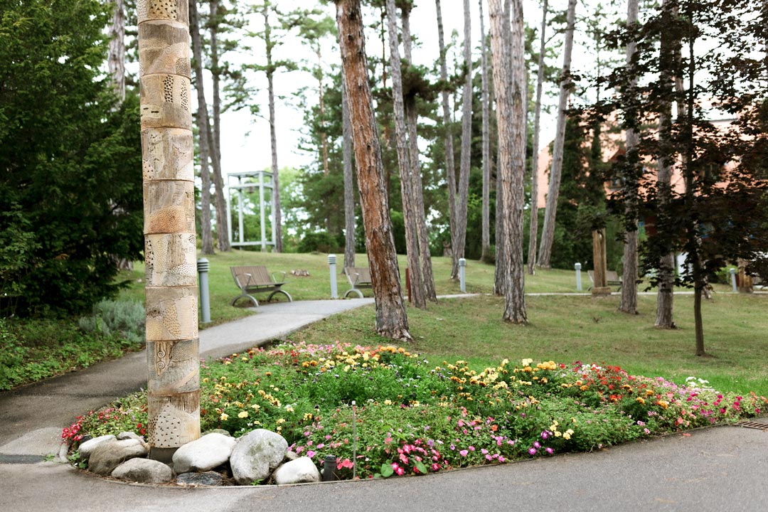 Das Haus liegt auf einer kleinen Anhöhe, umgeben vom idyllischen Föhrenwald. Ebene Wege, gemütliche Bänke und kunstvolle Skulpturen laden ein zum Verweilen in der Natur. Besonders beliebt als Ruheort ist die Mariengrotte. Menschen mit Demenz genießen die Natur im speziell geschützten Gartenbereich.